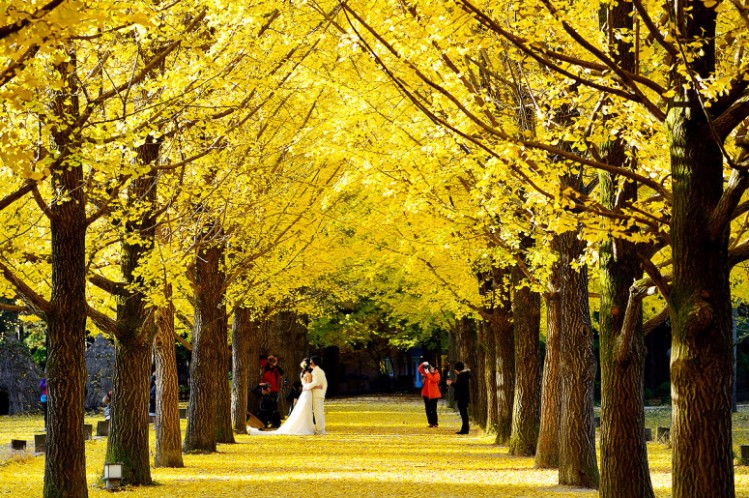 Là mùa đẹp nhất trên đảo Nami, thu thu hút lượng lớn khách du lịch. Cảnh thiên nhiên chuyển mình với sắc đỏ và vàng của cây ngân hạnh, con đường rực rỡ dưới tán lá vàng, tạo nên không gian lãng mạn cho các cặp đôi.